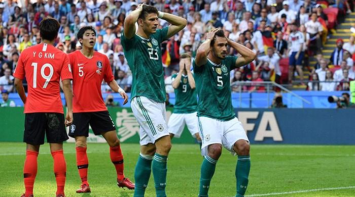 Germany´s forward Mario Gomez (L) and Germany´s defender Mats Hummels react after failing to score during the Russia 2018 World Cup Group F football match between South Korea and Germany at the Kazan Arena in Kazan on June 27, 2018....